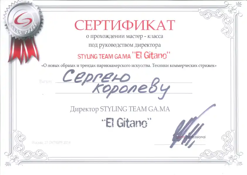 Окончил курсы академий: Pivot Point Vidal Sassoon, Wella Professional, Делорес. Курсы президента ассоциации парикмахеров Южной Америки El Gitano.